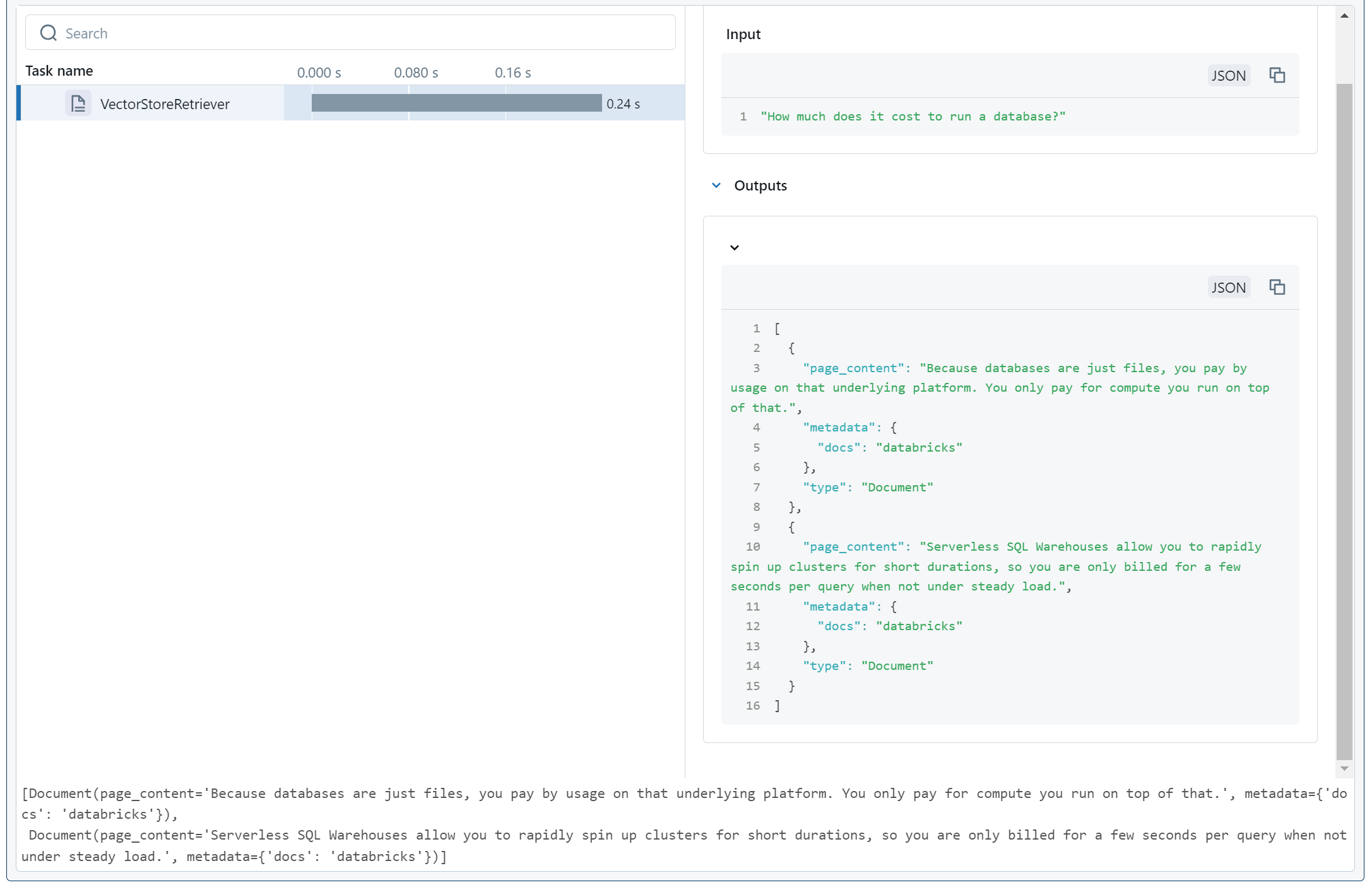 When we run this, MLFlow Tracing tracks how all the components of our chain invoke each other, and what their inputs and outputs are. It stores this data in a resilient location, but also conveniently displays it right away for us.
